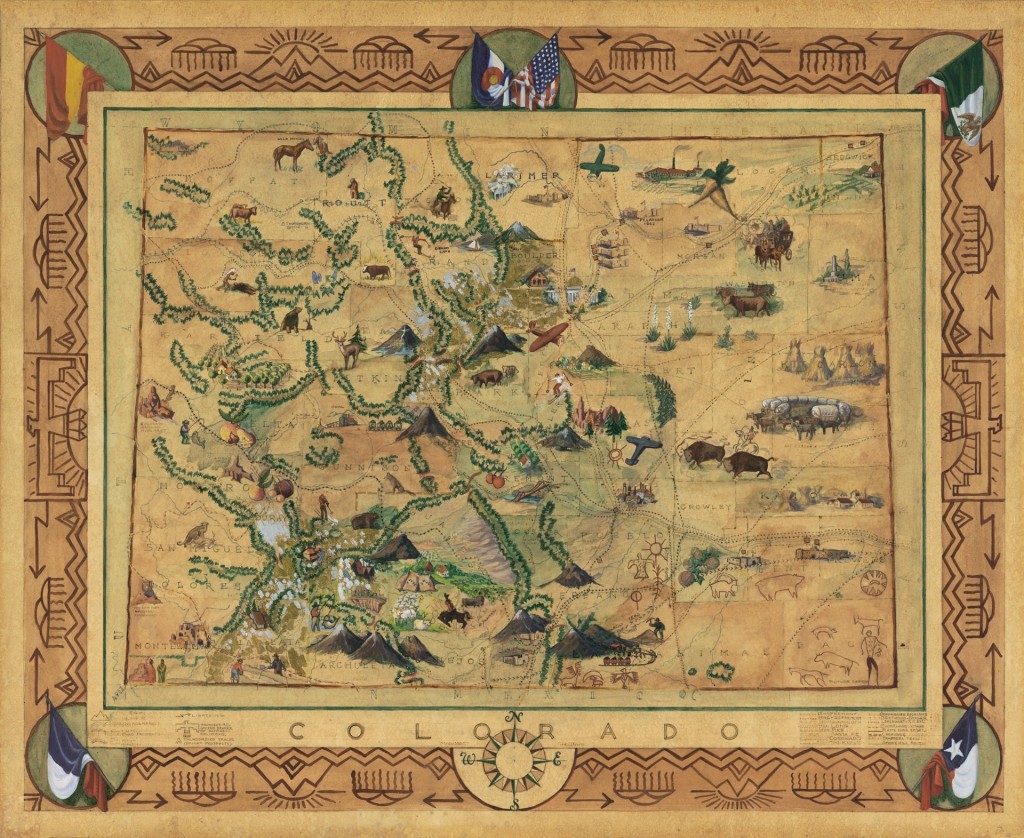 Margaret (age 26) married Albert James Galloway (age 29) in Washington D.C. on January 2, 1919. Margaret and AJ lived in St Louis for a short time where she did illustrations for newspaper department store ads. According to her aunt, “She also painted flowers which were pretty but not spectacular… [and] created some mosaics of flowers using very small pieces of egg shell that she dyed different colors and glued in place.” She also carved stone and painted illustrations on ceramics. Margaret either joined or worked for the US Women’s Army Corps where she designed some of their uniforms. While at Little Squaw Resort, Margaret created the illustrated map of Colorado (shown right). It includes many native animals as well as rivers, Indian paths, mountain ranges, mining areas (silver & gold), and other Colorado features. (Replicas can be purchased from The Studios at Bristol.)